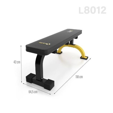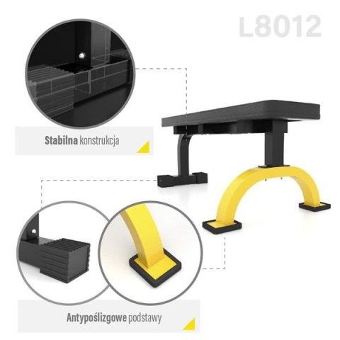 Solidna konstrukcja, gwarantuje bezpieczeństwo i wygodę oraz pozwala osiągnąć maksymalne obciążenie 200 kg. Pomimo swojej mocnej konstrukcji, ławka jest lekka, dlatego bardzo łatwo manewrować jej położeniem. Model L8012, to ławka pozioma która nie posiada możliwości regulacji kąta nachylenia oparcia. Przekłada się to na maksymalną stabilność.