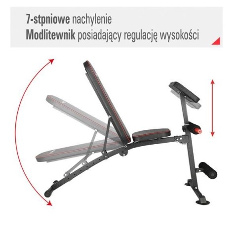 Modlitewnik posiada dwustopniową regulację wysokości, która pozwoli w wygodny sposób ćwiczyć niezależnie od wzrostu i długości ramion. Długość modlitewnia sprzyja bezpiecznemu - bez ryzyka przeprostu łokcia - ćwiczeniu mięśni ramion.
