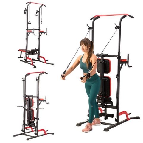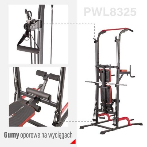 PWL8325 HMS, pozwoli wykonać ćwiczenia na wszystkie grupy mięśniowe górnych partii ciała. Konstrukcja produktu umożliwia wykonanie bardzo dużej ilości ćwiczeń. Użytkownik ma do dyspozycji drążek, poręcze do tzw. dipów, ławeczkę, podpórki do pompek, a także haki na których można umieścić sztangę. Jakby tego było mało, poręcz została wyposażona w wyciągi na których znajdują się gumy oporowe, co w doskonały sposób poszerza wachlarz możliwych do wykonania ćwiczeń. Wszystkie elementy pozwolą wykonać pełny, obszerny trening na klatkę piersiową, plecy, barki, biceps, triceps oraz brzuch.