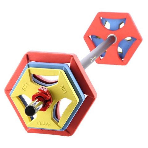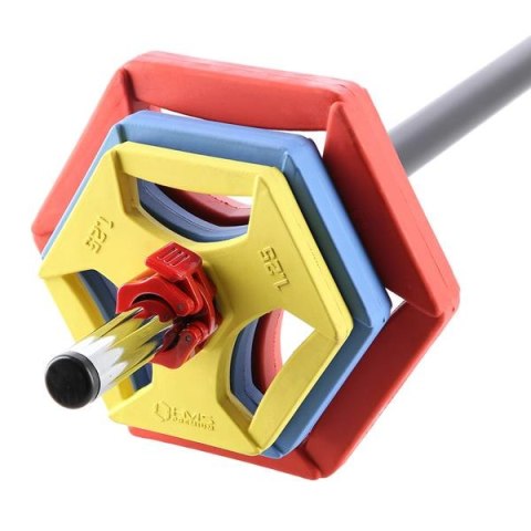 Gryf i talerze wykonane są z wysokiej jakości żeliwa, co zapewnia wyjątkową trwałość produktu. Gryf pokryty jest przyjemną w dotyku pianką, dzięki której dobrze leży w dłoni, nie ślizga się w trakcie ćwiczeń, zapobiega też odciskom i otarciom. Talerze pokryte są zaś kolorową gumą, gdzie każdy kolor odpowiada innemu obciążeniu. Absorbuje ona każde uderzenie - sztanga upuszczona na ziemię nie niszczy podłoża i sama nie ulega uszkodzeniom. Co ważne, talerze mają heksagonalny kształt, który jest optymalny dla ćwiczeń fitness, ponieważ po odłożeniu czy odrzuceniu sztangi zapobiega jej niekontrolowanemu odtoczeniu się. Dołączone do zestawu zaciski pozwalają na odpowiednie dociśnięcie talerzy i utrzymują je na swoim miejscu niezależnie od wykonywanego ćwiczenia.