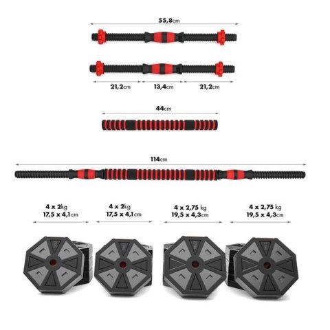 W skład zestawu wchodzą dwa gryfy, cztery zaciski, łączenie dwóch gryfów i łącznie 16 talerzy obciążeniowych.