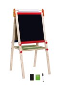 Stojąca dwustronna tablica od firmy Viga to idealny prezent, który ucieszy każde dziecko. Zabawka dedykowana dla każdego malucha, którego pasją jest tworzenie nowych dzieł i obrazków. Najmłodsi uwielbiają rysować dlatego prezentujemy coś co umożliwi im kreatywną zabawę. Z jednej strony planszy możliwe jest pisanie kredą, natomiast po drugiej stronie swobodnie można mazać pisakiem. Tablica wyposażona została w rolkę na której można umieścić papier do rysowania. Dzięki czterem magnetycznym klipsom dziecko z łatwością przyczepi kartkę papieru. Dodatkowo pod tablicą umieszona została półka z regulacją wysokości oraz z miejscem na przybory do pisania i rysowania.