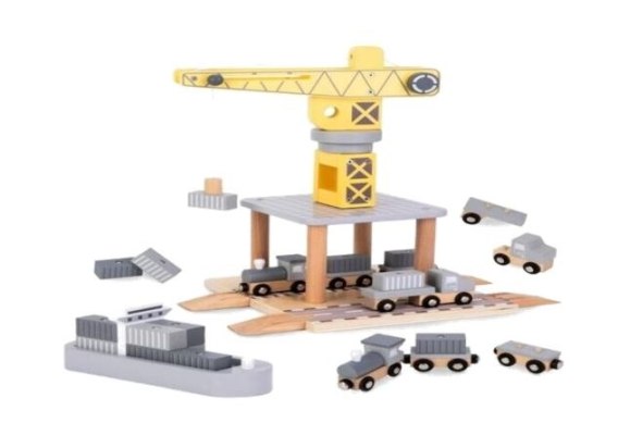 Drewniany port morski z dźwigiem to wspaniała zabawka dla małych miłośników transportu i budownictwa. Zestaw składa się z żółtego żurawia portowego, którym można obracać i podnosić kontenery ze statku na pojazdy transportowe - ciężarówkę i pociąg z dwoma wagonami. Różnorodne elementy pozwalają dziecku na odgrywanie scenek niczym z prawdziwego portu, rozwijając swoją kreatywność, zdolności manualne oraz koordynację ruchową.