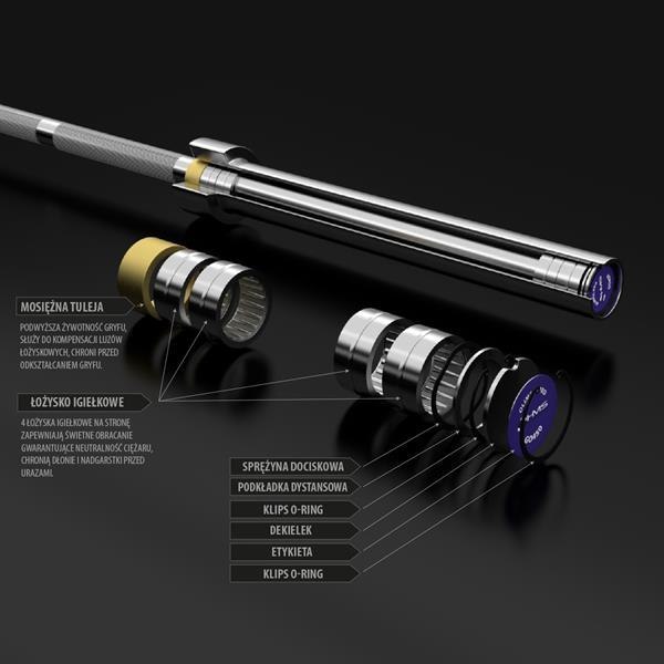 Gryf olimpijski GO450 HMS został wykonany ze specjalnej chromowanej stali, którą poddano procesowi hartowania. Produkt marki HMS cechuje wytrzymałość połączona z idealną elastycznością. W zestawie znajdują się dwa zaciski szczękowe. Pewny i wygodny chwyt gryfu zapewniono poprzez staranne radełkowanie. Maksymalne obciążenie wynosi 450 kilogramów. Z kolei średnica części chwytnej wynosząca 30 milimetrów zapewnia dużą wytrzymałość oraz komfort ćwiczenia. Zastosowany proces chromowania gryfu jest gwarancją zachowania jego wyglądu przez bardzo długi okres użytkowania oraz stanowi najlepsze zabezpieczenie przed rdzą. Gryf olimpijski GO450 HMS posiada 4 łożyska igiełkowe (po 2 na jedną stronę), które umożliwiają płynne obracanie się części na obciążenie. Jego konstrukcja eliminuje naprężenia na końcach wałeczków, w konsekwencji przekłada się na większą trwałość eksploatacyjną łożyska. Pomimo swojego małego przekroju poprzecznego, łożyska igiełkowe mają wysoką sztywność oraz nośność. Dwa zaciski szczękowe znajdujące się w zestawie, gwarantują stabilne położenie ciężaru na gryfie w czasie wykonywania ćwiczeń. Nasadki posiadają w części wewnętrznej gumowe elementy zapobiegające luzowaniu się obciążenia.