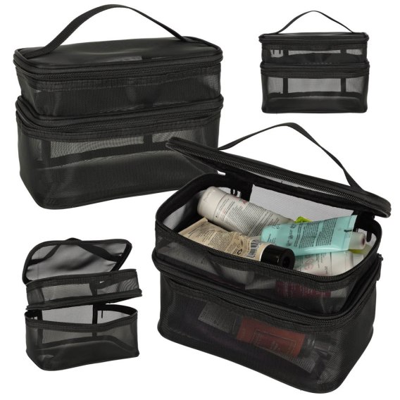 Praktyczna kosmetyczka podróżna - to must-have podczas każdej podroży. Dzięki dwupoziomowej konstrukcji umożliwia zorganizowanie kosmetyków. Jest zapinana na dwustronny zamek błyskawiczny. Wykonana z siateczkowego materiału ułatwiającego znalezienie schowanych produktów. Posiada praktyczną rączkę dla wygodnego przenoszenia.
