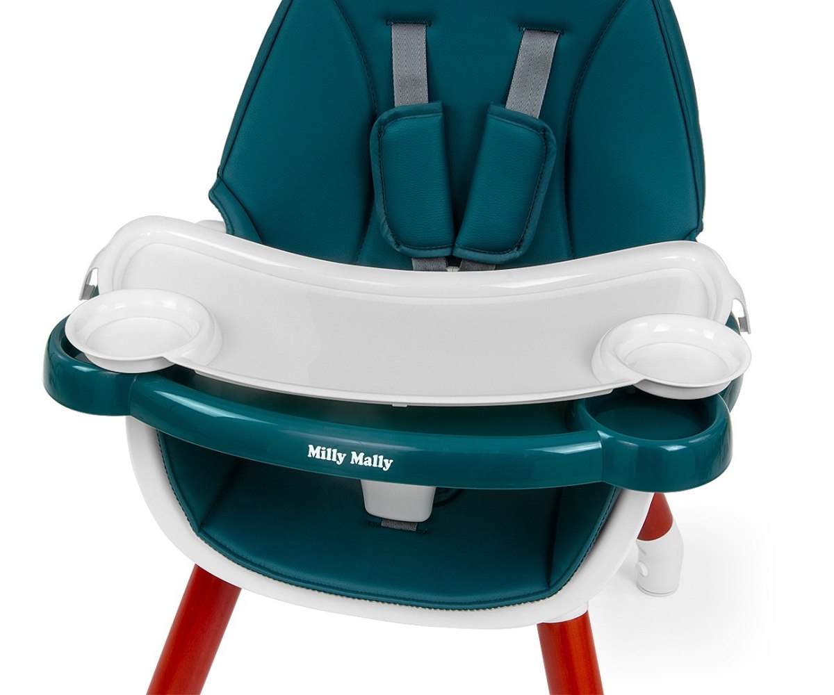5-punktowe pasybezpieczeństwa wyposażone w szerokie i miękkie osłonki na ramiona, zabezpieczają dziecko przed otarciami. Tapicerka krzesełka Malmo wykonana z ekoskóry jest odporna na zabrudzenia i łatwa w utrzymaniu czystości. Tacka posiada wgłębienie, które zapobiega zsunięciu się przedmiotów na niej umieszczonych.