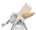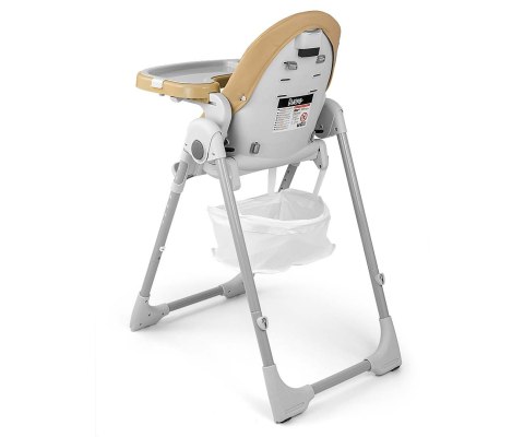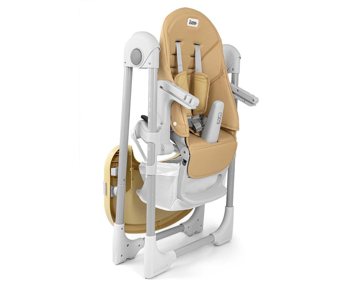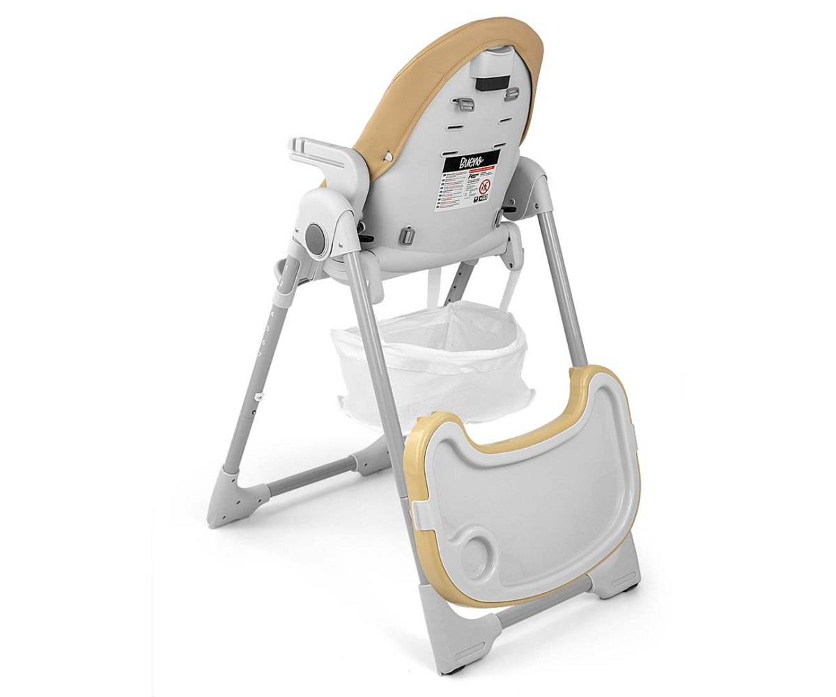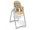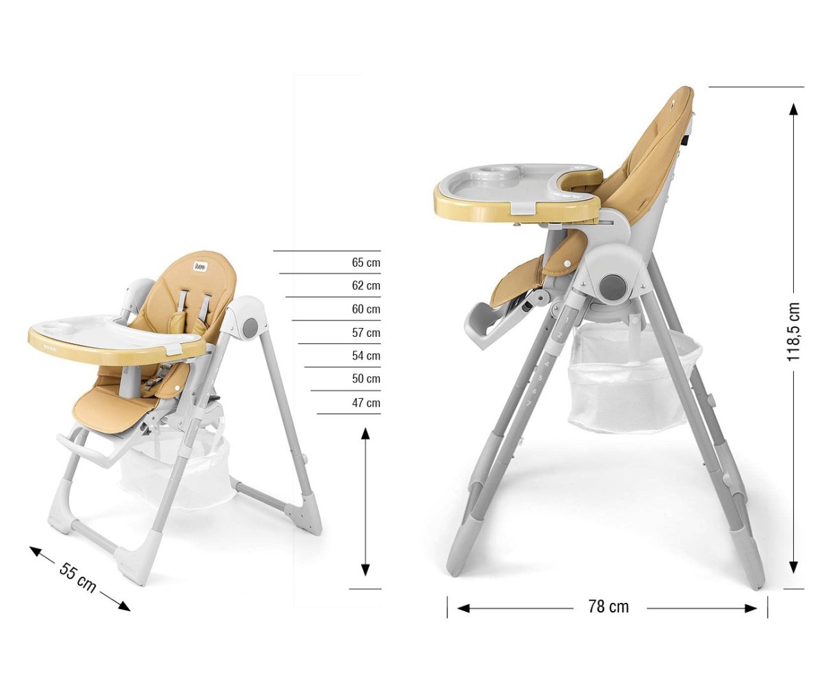 Poszycie krzesełka wykonane jest z ekologicznej skóry i posiada dodatkową miękką wkładkę dla najmłodszych. Dla bezpieczeństwa dziecka wyposażone jest w 5-punktowe regulowane pasy oraz dodatkową barierę krokową, zabezpieczającą przed ześlizgnięciem. Wyposażone jest również w wypinaną tackę z nakładką. Z tyłu oparcia znajduje się mocowanie do zawieszenia tacki, gdy nie jest ona użytkowana. Oparcie i podnóżek mają możliwość rozłożenia do pozycji leżącej. Siedzisko można unosić bądź obniżać w 7 stopniowej skali a w nóżkach wbudowane są gumowe kółka. Całą konstrukcję łatwo i płynnie można złożyć do niedużych rozmiarów.