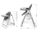 Poszycie krzesełka wykonane jest z ekologicznej skóry i posiada dodatkową miękką wkładkę dla najmłodszych. Dla bezpieczeństwa dziecka wyposażone jest w 5-punktowe regulowane pasy oraz dodatkową barierę krokową, zabezpieczającą przed ześlizgnięciem. Wyposażone jest również w wypinaną tackę z nakładką. Z tyłu oparcia znajduje się mocowanie do zawieszenia tacki, gdy nie jest ona użytkowana. Oparcie i podnóżek mają możliwość rozłożenia do pozycji leżącej. Siedzisko można unosić bądź obniżać w 7 stopniowej skali a w nóżkach wbudowane są gumowe kółka. Całą konstrukcję łatwo i płynnie można złożyć do niedużych rozmiarów.