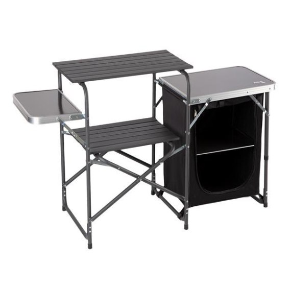 - Blaty boczne z łatwością można złożyć, zmniejszając tym samym gabaryty szafki, co pozwala na dostosowanie się do każdych warunków biwakowania.