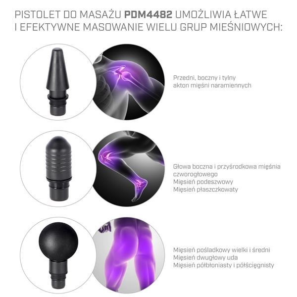 Masażer sprawdzi zarówno u sportowców, u osób z siedzącym trybem życia jak również dla fizjoterapeutów. Produkt posiada 6 wymiennych końcówek, co w połączeniu z aż dwudziestoma poziomami prędkości, pozwoli dopasować masaż, do każdego rodzaju mięśnia. PDM4482G jest mocnym urządzeniem, dwudziesty poziom prędkości, to aż 3200 ruchów na minutę. Pozwala to wykonać, naprawdę dogłębny masaż.
