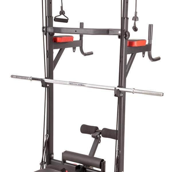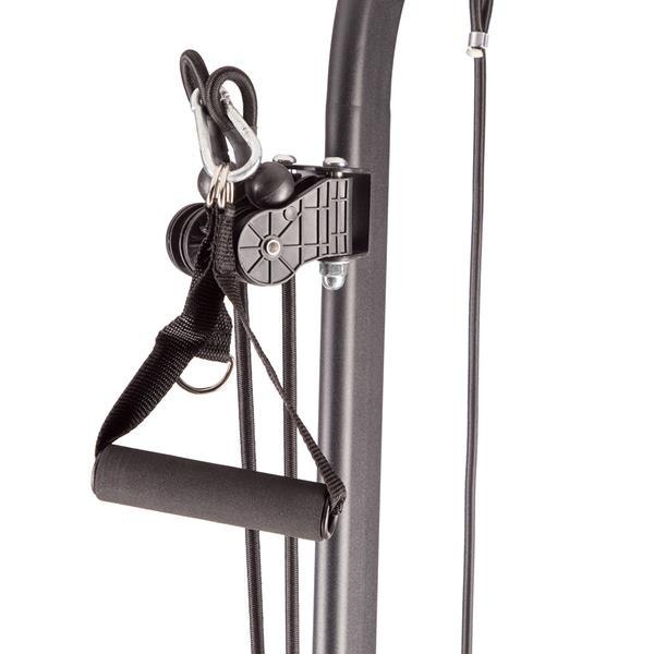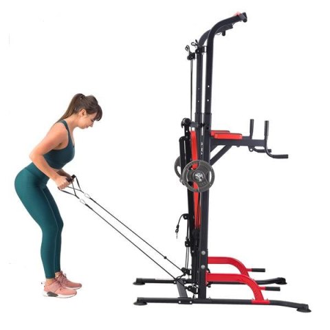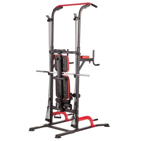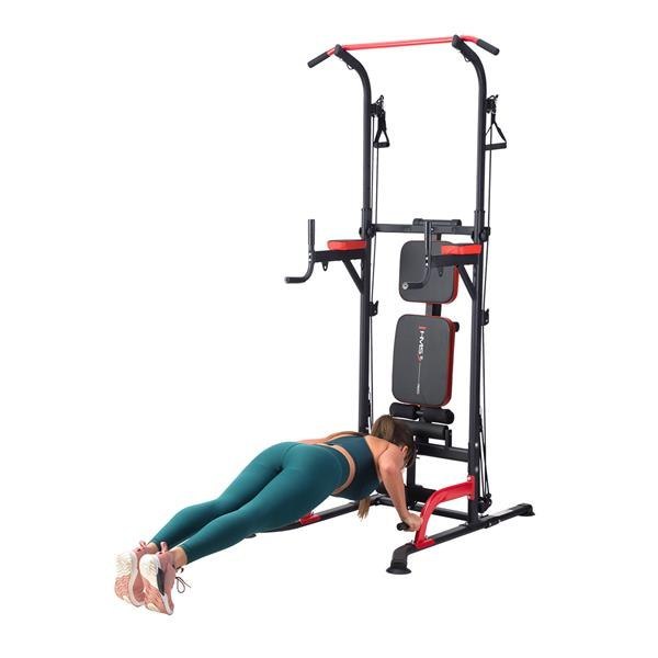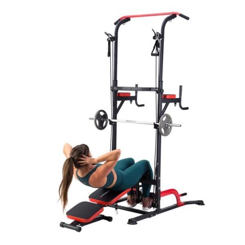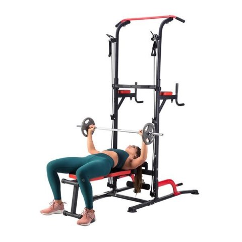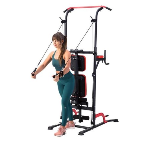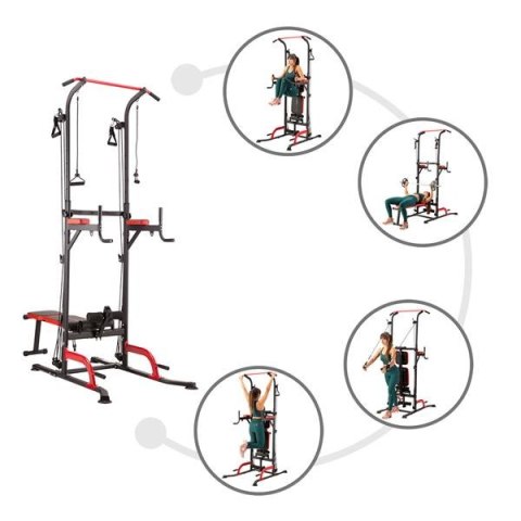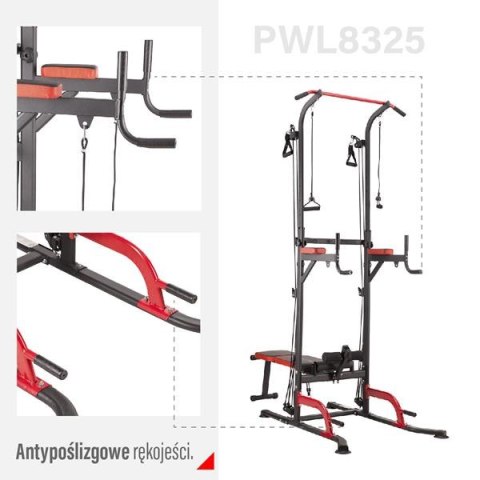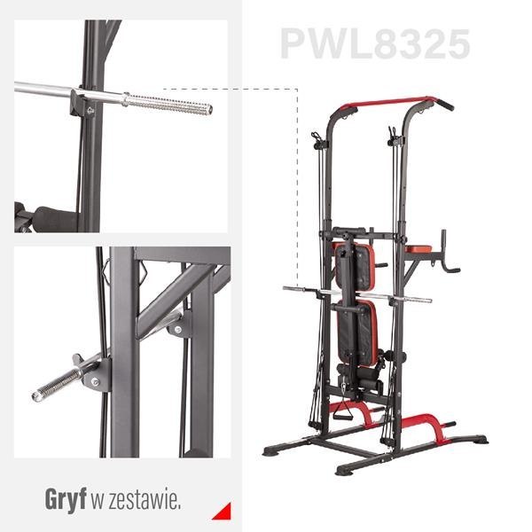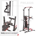 PWL8325 HMS, pozwoli wykonać ćwiczenia na wszystkie grupy mięśniowe górnych partii ciała. Konstrukcja produktu umożliwia wykonanie bardzo dużej ilości ćwiczeń. Użytkownik ma do dyspozycji drążek, poręcze do tzw. dipów, ławeczkę, podpórki do pompek, a także haki na których można umieścić sztangę. Jakby tego było mało, poręcz została wyposażona w wyciągi na których znajdują się gumy oporowe, co w doskonały sposób poszerza wachlarz możliwych do wykonania ćwiczeń. Wszystkie elementy pozwolą wykonać pełny, obszerny trening na klatkę piersiową, plecy, barki, biceps, triceps oraz brzuch.