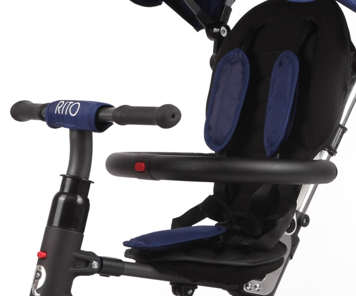 RITO jest stabilny i bezpieczny, posiada nowoczesną konstrukcję i wygodne wyprofilowane siedzisko. Rowerek został wyposażony w barierkę zabezpieczająca dziecko przed wypadnięciem, pięciopunktowe pasy bezpieczeństwa oraz podnóżki, a piankowe koła umożliwiają cichą i komfortową jazdę. Po zdemontowaniu rączki, barierek, budki i pokrowca na siedzisko RITO będzie służył jako rowerek trójkołowy. Dzięki funkcji „wolnego koła i kierownicy" dziecko może swobodnie pedałować i skręcać, a rączka dla rodzica nadal może korygować prędkość i kierunek przemieszczania.