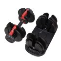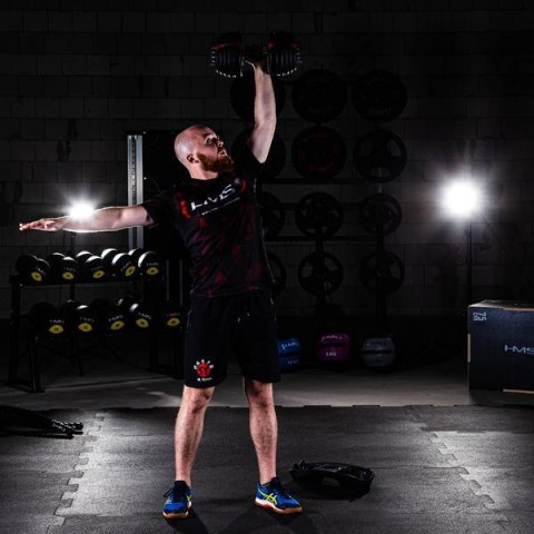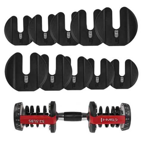 SR52 HMS to regulowana sztangielka. Zestaw zawiera gryf, 10 talerzy oraz podstawkę. Przyrząd jest idealnym rozwiązaniem dla osób ćwiczących w domu, ale z powodzeniem sprawdzi się też na sali treningowej, zastępując cały stojak tradycyjnych hantli. Zastosowanie innowacyjnego systemu montowania talerzy umożliwia bardzo szybką i łatwą zmianę obciążenia w trakcie treningu. W przeciwieństwie do tradycyjnych hantli, zdjęcie i założenie talerzy nie wymaga każdorazowego odkręcania zacisków oraz nakładania i zdejmowania talerzy. W SR52 wystarczy odłożyć sztangielkę na podstawkę i dwoma pokrętłami ustawić pożądane obciążenie. Po ponownym podniesieniu sztangielki będą znajdować się na niej talerze odpowiadające wybranemu ustawieniu. Produkt został wykonany z materiałów najwyższej jakości. Dużym atutem SR52 HMS jest uchwyt sztangielki, o ergonomicznym kształcie, pokryty materiałem antypoślizgowym. Regulowane sztangielki marki HMS stanowią innowacyjne rozwiązanie dla miłośników sportów siłowych - 10 talerzy pozwala na dowolną regulację obciążenia w zależności od potrzeb użytkownika. Uwaga: wszystkie wartości obciążenia znajdujące się na produkcie podane są w funtach (lbs). 1 funt = 0,45 kg