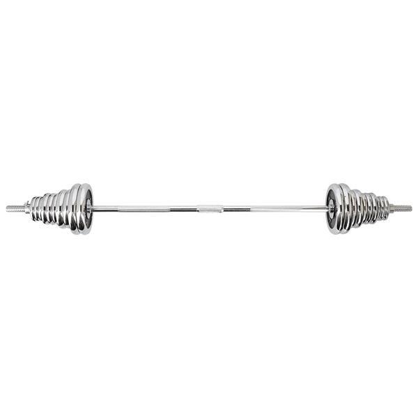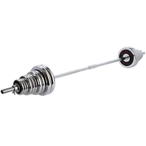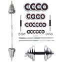 W skład zestawu wchodzą dwa krótkie gryfy, długi skręcany gryf, sześć zacisków i łącznie 20 talerzy obciążeniowych. Całość znajduje się w wygodnej walizce. Łączna waga zestawu to 50 kg, dlatego dla łatwiejszego transportu, walizka posiada kółka, co pomaga w przemieszczaniu się ze sprzętem.