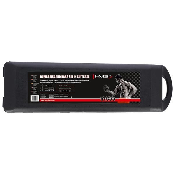 STC55 HMS, to zestaw dwóch sztangielek z wymiennym obciążeniem, skręcanego długiego gryfu, łamanego gryfu oraz możliwością złączenia dwóch krótkich gryfów w jeden średni. Mnóstwo konfiguracji, mnóstwo możliwości treningowych, a to wszystko w jednej walizce.