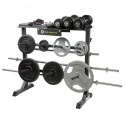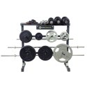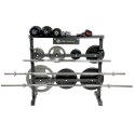 STR12 wyposażony został w 4 uchwyty na gryfy, 7 bolców na obciążenie (talerze) oraz górne miejsce na hantle, dzięki temu idealnie posegregujemy nasz sprzęt. Górne miejsce na sprzęt posiada zabezpieczenia po obu stronach, zapobiegające zsunięciu się hantli oraz materiał tłumiący i chroniący stojak.